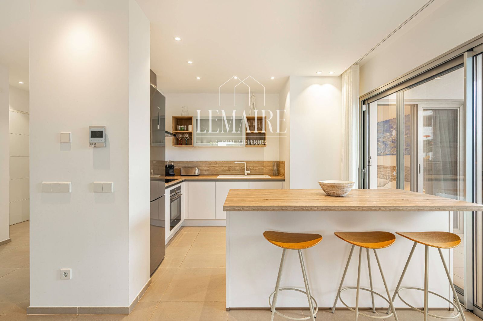 Desde el refinado hall de entrada, que dispone de aseo de cortesía, se accede a una luminosa zona de estar de concepto abierto integrada con una moderna cocina de diseño. La cocina, equipada con acabados premium, incorpora barra desayunadora, mobiliario a medida y electrodomésticos Siemens de alta gama. Desde esta estancia se accede directamente a las terrazas, elegantemente amuebladas y concebidas como auténticas extensiones del espacio interior, ideales para relajarse, recibir invitados o disfrutar de cenas al aire libre.
